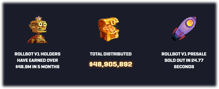 <figure><img src="https://2114374709-files.gitbook.io/~/files/v0/b/gitbook-x-prod.appspot.com/o/spaces%2F0Hksfj8bReMx2tKRcTUm%2Fuploads%2FCH1MWwef34nyvbHS1XZQ%2FV1%20Profit.png?alt=media&#x26;token=135c9b45-689e-4457-b19e-ae0f2b3306c7" alt=""><figcaption><p>Rollbot holders have collectively earned over $48,000,000</p></figcaption></figure>